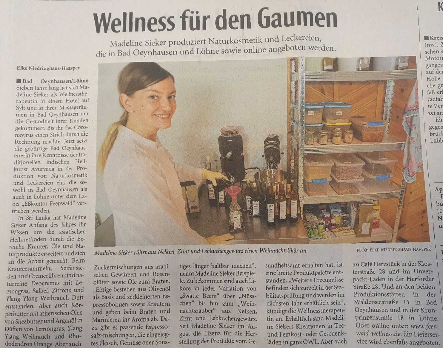 Heute ist ein Zeitungsartikel in der Neuen Westfälischen im Lokalteil von Bad Oeynhausen über mich und meine Arbeit erschienen. Vielen lieben Dank, ich freue mich über den gelungenen Bericht. Ihr seht mich dabei, wie ich die neue Special Edition Espressolikör "Weihnachts Zauber" einfülle. Den gibt es nun auch als Teelikör in großen Tannenbaumflaschen (200ml) und in kleinen Tannenbäumchen (40ml). Denkt an den Rabattcode FEENWALD für 15% Rabatt!